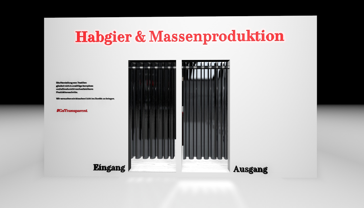 Das Projekt „Habgier und Massenproduktion“ beschäftigt sich umfassend mit dem Thema „Fast Fashion“. Besucher sollen ein Grundverständnis für die Problematik dieser bekommen, ihren Konsum hinterfragen und über mögliche Lösungen nachdenken. Woher kommt ihre Kleidung? Welche Folgen hat das heutige Kaufverhalten? Welche Lösungen gibt es bereits? „Habgier und Massenproduktion“ möchte mehr Transparenz schaffen in einer Industrie, die wenig über sich preisgibt, mit dem Ziel ein Umdenken der Besucher zu bewirken. #GoTransparent