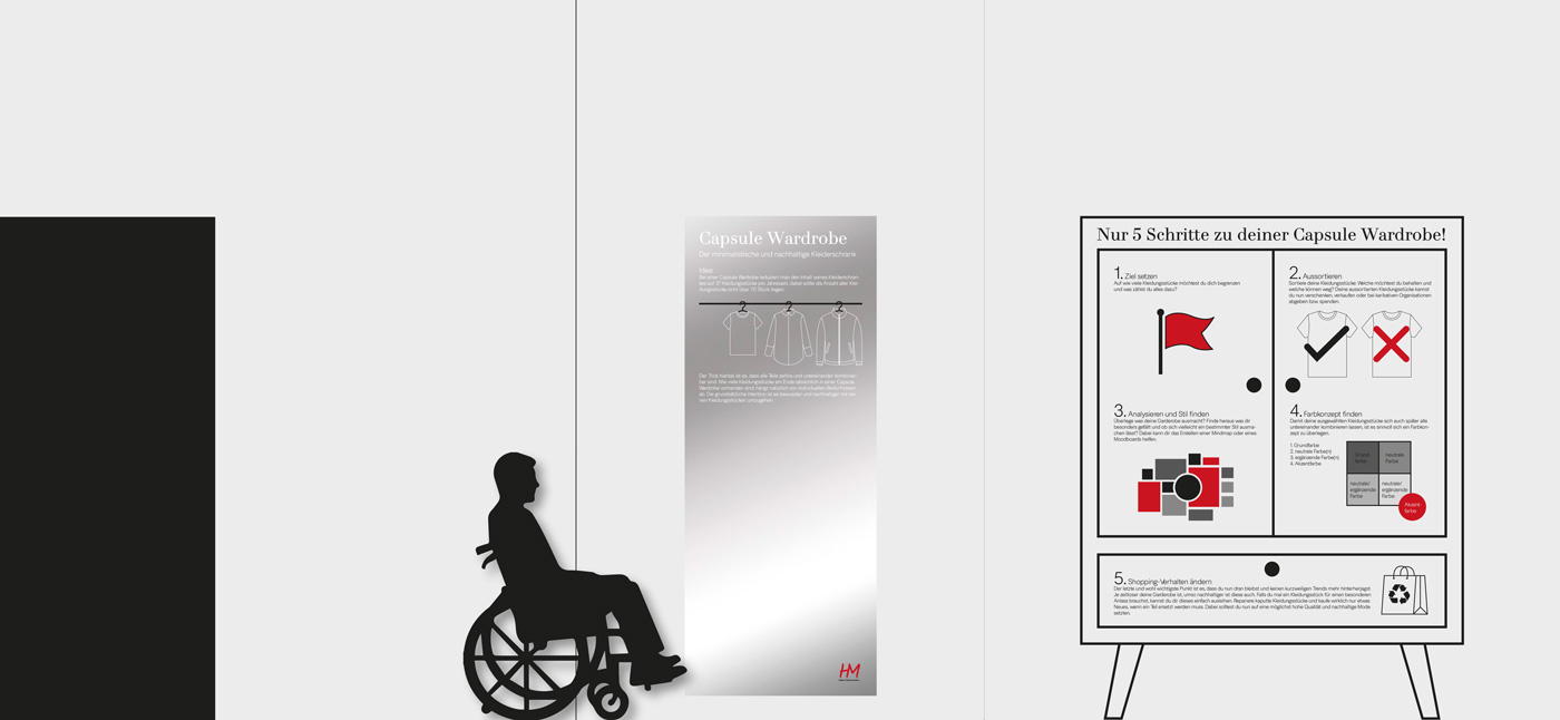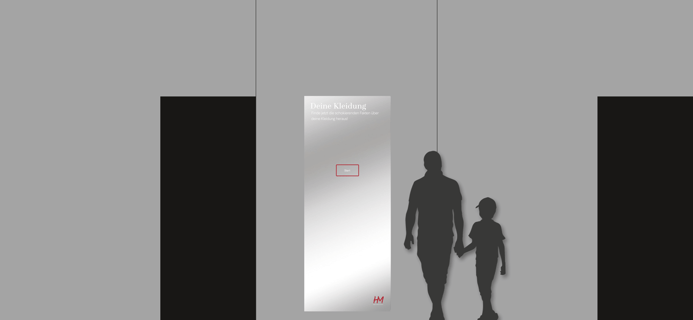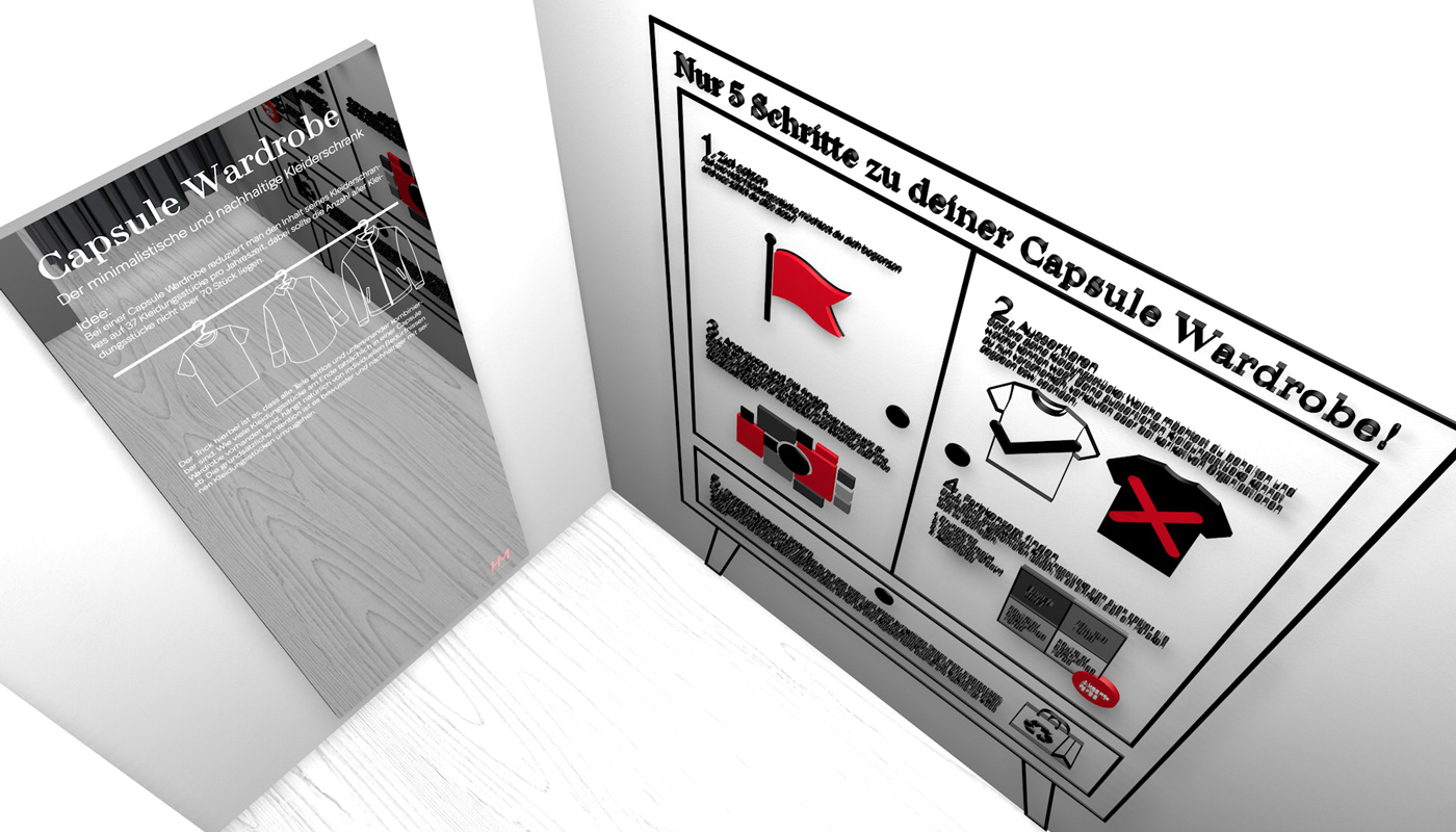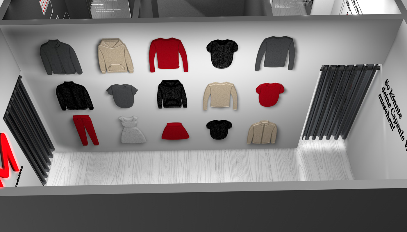 Um Informationen über die Fast Fashion Industrie zu übermitteln hatten Anna und Franziska die Idee, einen interaktiven Monitor, möglicherweise in Form eines Spiegels, zu gestalten, welcher Fakten zur Kleidung liefert, die man in diesem Moment trägt. Carola beschäftigte sich parallel mit der gleichen Thematik, allerdings mit dem Ansatz, eine Einkaufssituation eines H&M´s zu simulieren und ebenfalls über Spiegel und Etiketten zu informieren. Aufgrund der thematischen Überschneidung entschieden sich die Teams dazu eine dreier Gruppe zu bilden und somit fusionierten sich auch die Konzepte. Das Endprodukt bildet nun ein Raumkonzept aus vier Räumen, welche jeweils verschiedene Informationsbereiche widerspiegeln. Um eine realitätsnahe und glaubwürdige Gestaltung zu erreichen wurde sich das Design des wohl bekanntesten Fast Fashion Unternehmens H&M zum Vorbild genommen. Zu Beginn geht der Besucher durch eine Art Tunnel, bestehend aus den ersten drei Räumen, welche den Aufbau einer Umkleide simulieren. Raum eins soll durch Infografiken an Wänden und einem Spiegel grundlegende Fakten der Fast Fashion Industrie übermitteln. Basierend auf diesen befindet sich in Raum zwei der interaktive Monitor, wie zuvor von Anna und Franziska geplant. Der dritte Raum erklärt dann durch Infografiken, ähnlich wie in Raum eins, das Prinzip eines Capsule Wardrobe’s. Anschließend gelangt der Besucher in Raum vier, den „Showroom“. Dieser ist größer als die vorherigen Räume und grenzt sich auch vom Aufbau, von den anderen Räumen ab. Hier wird einmal beispielhaft gezeigt, wie ein bewusster und nachhaltiger Kleiderschrank aussehen könnte. Auch die anfängliche Idee der Informationsetiketten von Carola, wird hier wieder aufgenommen.
