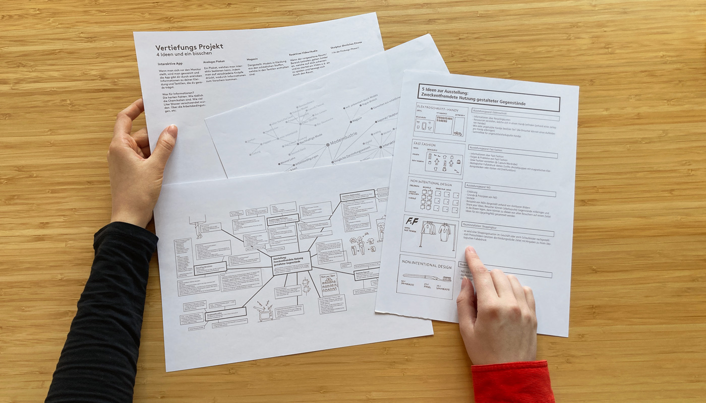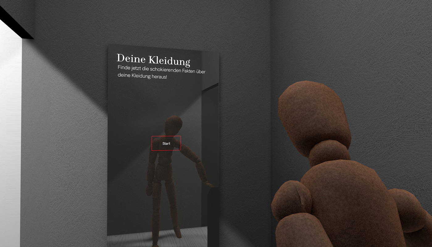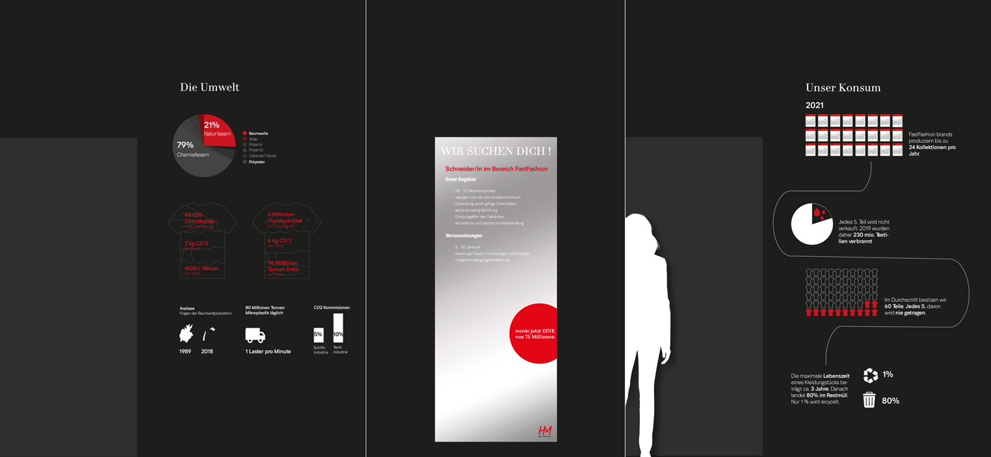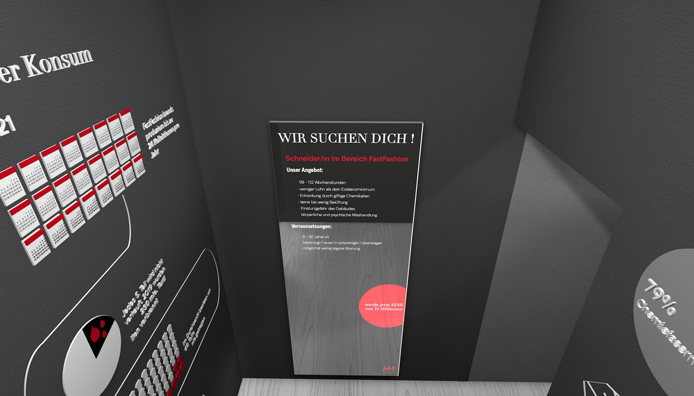 Um Informationen über die Fast Fashion Industrie zu übermitteln hatten Anna und Franziska die Idee, einen interaktiven Monitor, möglicherweise in Form eines Spiegels, zu gestalten, welcher Fakten zur Kleidung liefert, die man in diesem Moment trägt. Carola beschäftigte sich parallel mit der gleichen Thematik, allerdings mit dem Ansatz, eine Einkaufssituation eines H&M´s zu simulieren und ebenfalls über Spiegel und Etiketten zu informieren. Aufgrund der thematischen Überschneidung entschieden sich die Teams dazu eine dreier Gruppe zu bilden und somit fusionierten sich auch die Konzepte. Das Endprodukt bildet nun ein Raumkonzept aus vier Räumen, welche jeweils verschiedene Informationsbereiche widerspiegeln. Um eine realitätsnahe und glaubwürdige Gestaltung zu erreichen wurde sich das Design des wohl bekanntesten Fast Fashion Unternehmens H&M zum Vorbild genommen. Zu Beginn geht der Besucher durch eine Art Tunnel, bestehend aus den ersten drei Räumen, welche den Aufbau einer Umkleide simulieren. Raum eins soll durch Infografiken an Wänden und einem Spiegel grundlegende Fakten der Fast Fashion Industrie übermitteln. Basierend auf diesen befindet sich in Raum zwei der interaktive Monitor, wie zuvor von Anna und Franziska geplant. Der dritte Raum erklärt dann durch Infografiken, ähnlich wie in Raum eins, das Prinzip eines Capsule Wardrobe’s. Anschließend gelangt der Besucher in Raum vier, den „Showroom“. Dieser ist größer als die vorherigen Räume und grenzt sich auch vom Aufbau, von den anderen Räumen ab. Hier wird einmal beispielhaft gezeigt, wie ein bewusster und nachhaltiger Kleiderschrank aussehen könnte. Auch die anfängliche Idee der Informationsetiketten von Carola, wird hier wieder aufgenommen.