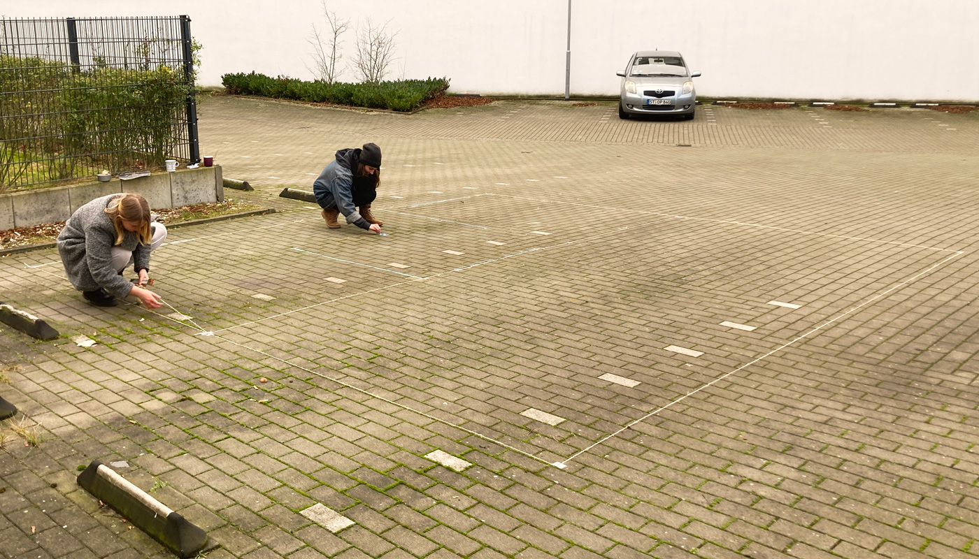 Grundrissplanung mit Hilfe von Kreide, Schnur und Klebeband zur Untersuchung des Maßstabs