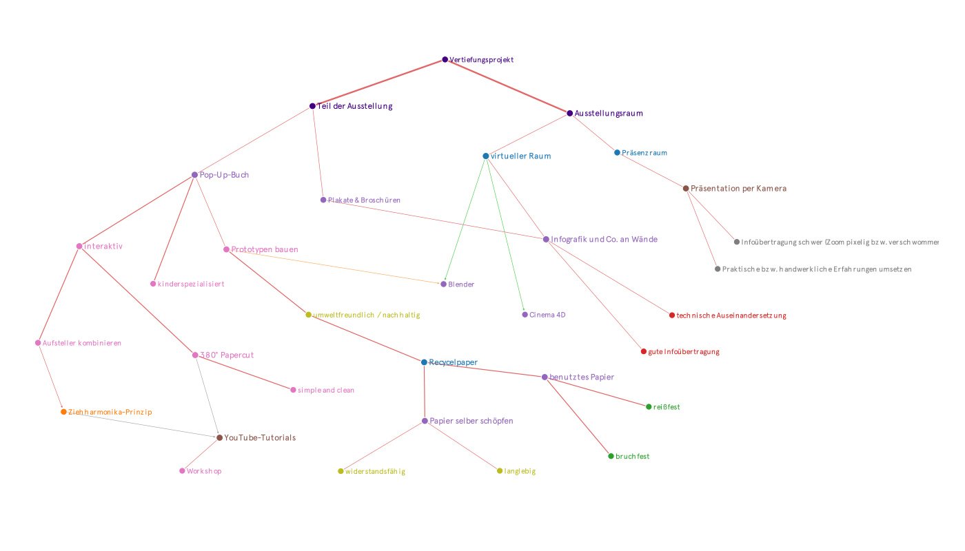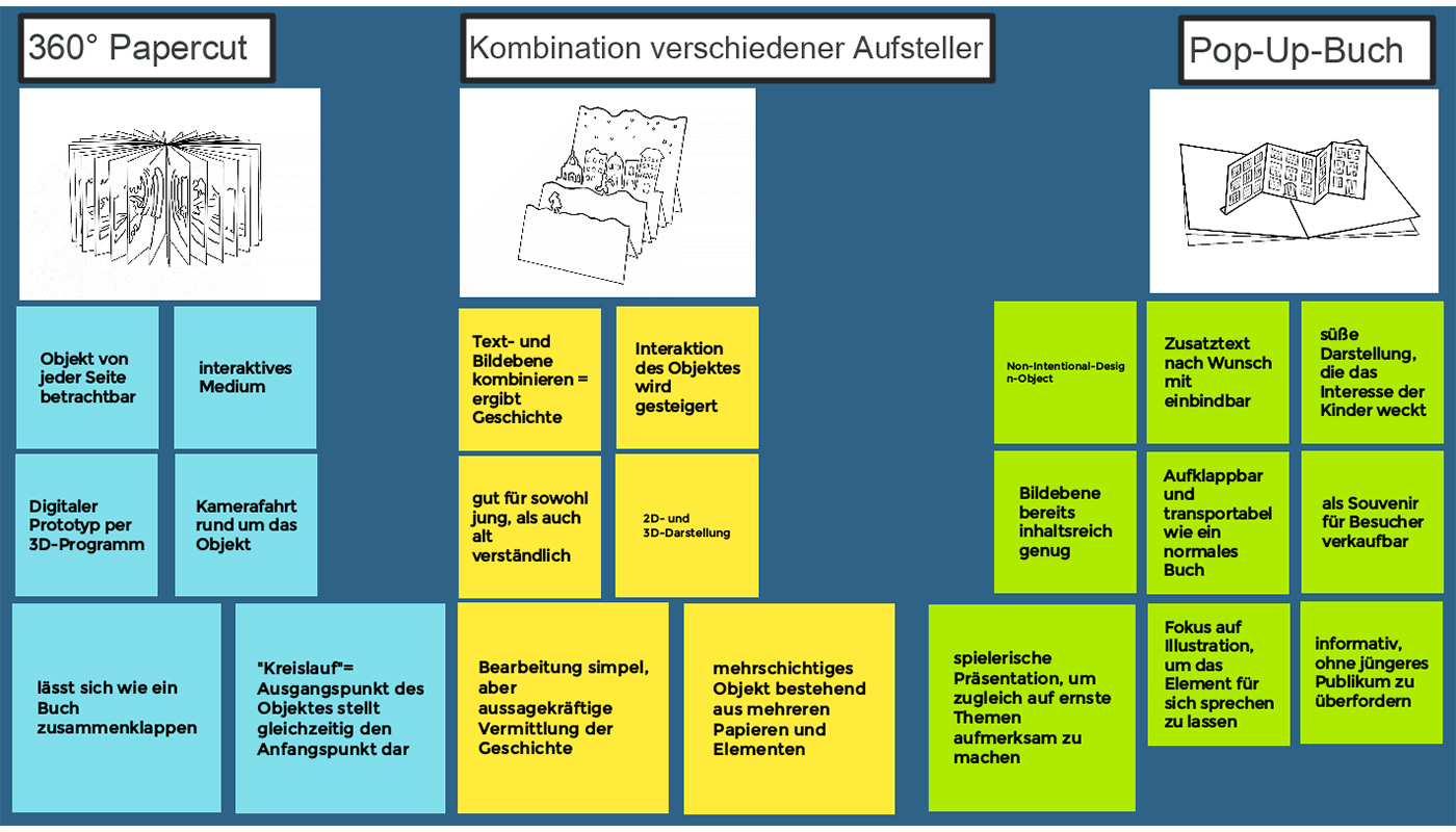 Zu Anfang unseres Projekts begannen wir mit einem Brainstorming, welches anschließend in einer Mindmap mündete. Dabei stellten wir uns die Frage: Wollen wir ein Ausstellungsstück oder einen ganzen Raum gestalten? Inspiriert von den Semesterprojekten sammelten wir anschließend verschiedene Arten der Präsentation. Diese reichen von einem Pop-Up-Buch über Infografiken bis hin zu einem virtuellen Raum. Nach weiteren Überlegungen verwarfen wir jedoch den Ansatz eines gesamten Ausstellungsraumes, da die Gestaltung dessen nur digital möglich gewesen wäre und uns die technischen Möglichkeiten hierfür fehlten. So entschieden wir uns also für den Ansatz ein einzelnes Ausstellungsstück zu gestalten.