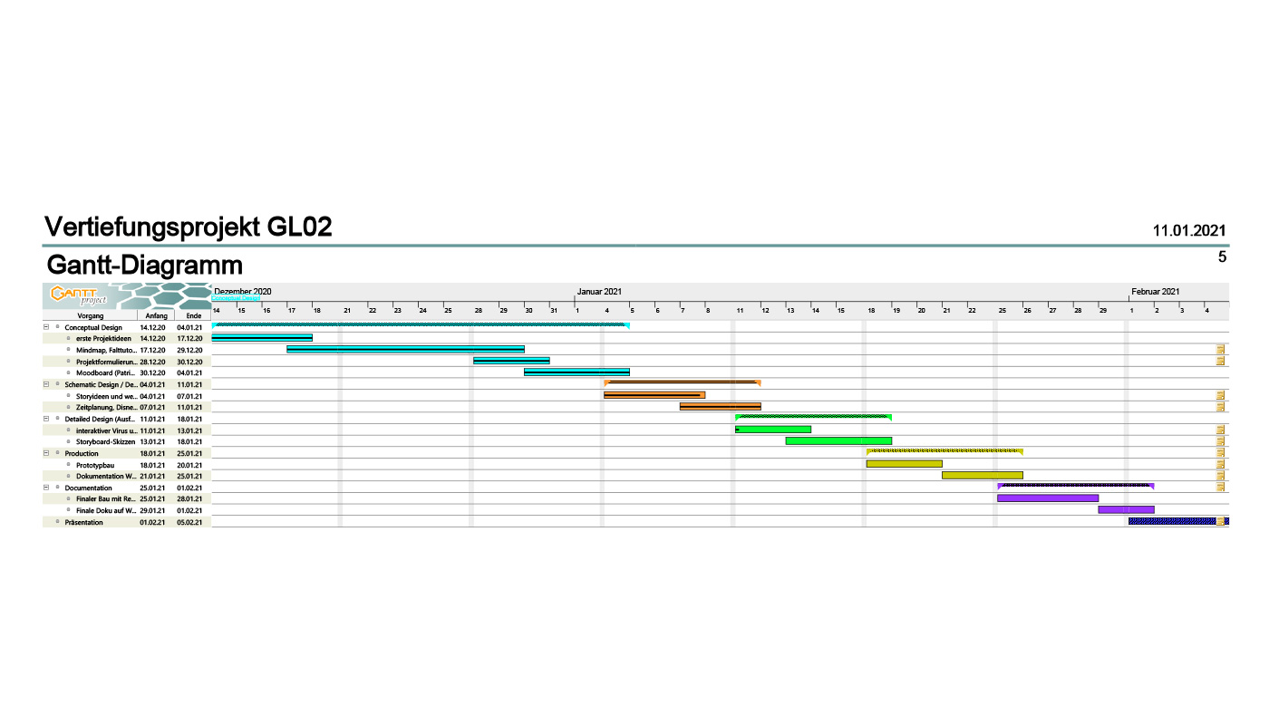 Für die Visualisierung dieses Projektes erarbeiteten wir zum Schluss der Phase noch einen genauen Zeitplan, der jeden Schritt genau dokumentiert und die Arbeit gerecht aufteilte.