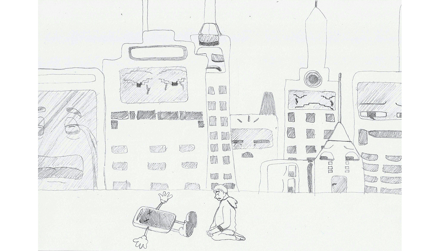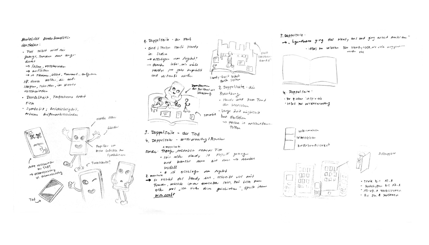 So entwickelte sich ein grober Entwurf der Geschichte, die wir erzählen wollten: Ein Teenager namens Tim ist auf der Suche nach einem neuen Handy. Er wird fündig und benutzt sein neues Handy Tag und Nacht bis es eines Tages plötzlich nicht mehr funktioniert. Anschließend bringt er es in die Reparatur, wo es zwar nicht gerettet werden kann, aber die Einzelteile einem neuen Handy zum Leben verhelfen. Und die Geschichte beginnt wieder von vorne. Stattfinden soll diese Geschichte auf insgesamt vier Doppelseiten, die jeweils ein Stadium des Konsums zeigen.