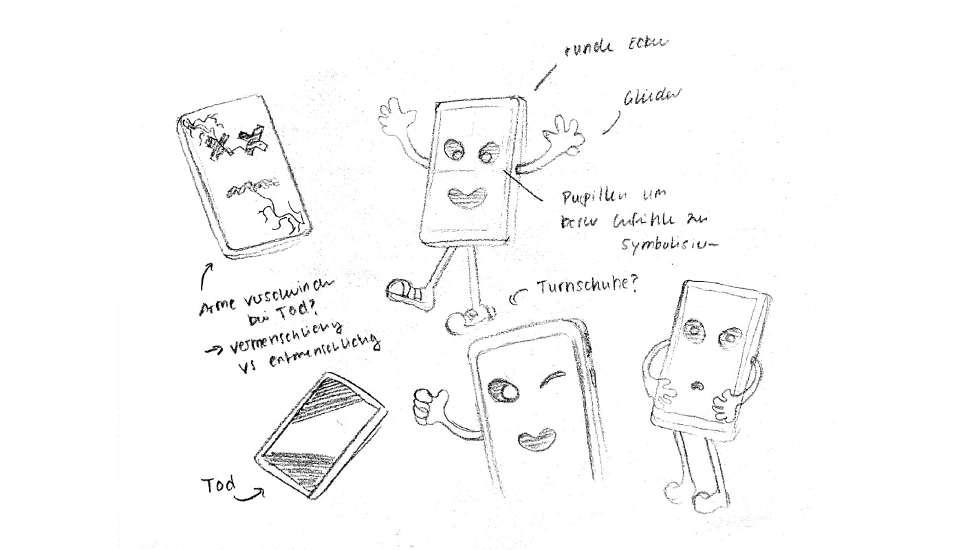 Zeitgleich stießen wir auf eine Grafik, welche die Phasen des Konsums thematisiert. In einem schier unendlichen Kreislauf zirkulieren Auswahl und Beschaffung, Ge- und Verbrauch sowie Entsorgung und Wiederverwertung. Wenn das Handy in unserer Geschichte aber zum sprichwörtlichen Freund des Menschen werden sollte und der Kreislauf zirkulieren sollte, dann musste dieses früher oder später den Geist aufgeben. Die Thematik „Tod“ eröffnete uns dabei eine völlig neue Problematik; denn wie stellt man den Tod kinderfreundlich dar?