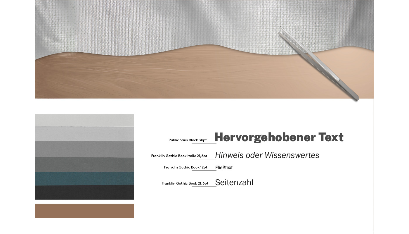Für den Textteil soll eine serifenlose Schriftart verwendet werden, denn Serifen wirken streng und altmodisch. Die verschiedenen Schriftschnitte am Beispiel von der letzten Doppelseite haben wir in einem Styleboard festgehalten. Unserer Meinung nach erschien uns Franklin Gothic Book in Hinsicht auf gute Leserlichkeit die beste Wahl neben Public Sans, welches wir lediglich für hervorgehobene Texte verwendet haben.