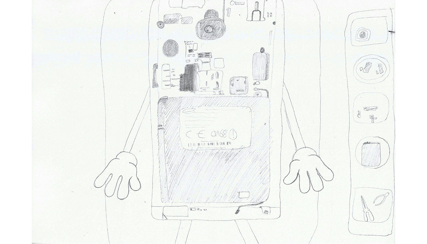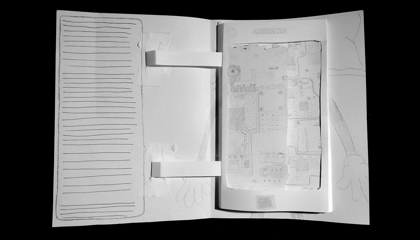 In zahlreichen Zeichnungen und Skizzen hielten wir verschiedene Layouts und Darstellungen unserer Geschichte fest. Diese dienten uns als Vorlage für den Bau der Prototypen. Während der Erstellung dieser kam uns außerdem der Einfall, dass man zusätzlich zu den Pop-Up-Elementen auch noch weitere interaktive Dinge einbauen könnte, wie Fenster, die sich öffnen lassen, oder Teile, die sich austauschen lassen. Besonders letztere Idee fanden wir sehr gut und integrierten diese in unsere Planung der vierten Doppelseite ein. Inspiriert von dem Spiel „Dr. Bibber“ sollte der Betrachter das Innenleben des Handys herausnehmen und austauschen können.
