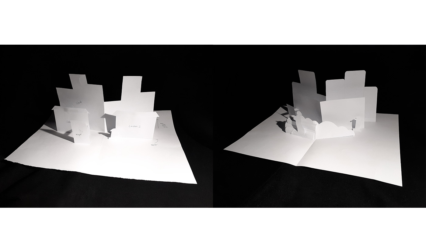 Jasmin baute zu Beginn mehrere Prototypen zur ersten Hälfte der Geschichte, die nach dem Prinzip der Parallel- und V-Faltung funktionieren. Am prominentesten davon ist die V-Faltung, welche in der Falz zwischen den Seiten platziert wird und so beim Aufklappen die weiteren Elemente hochzieht.