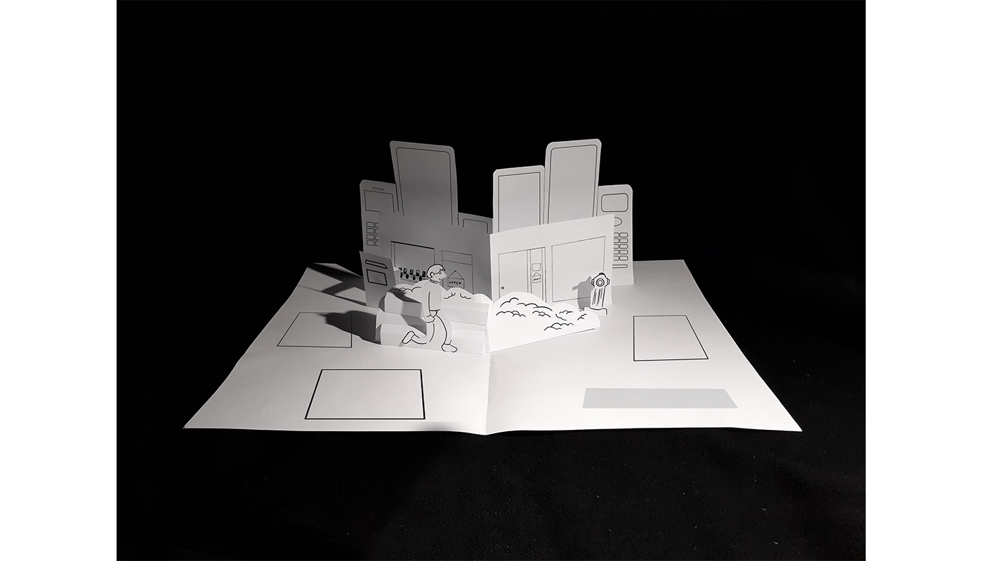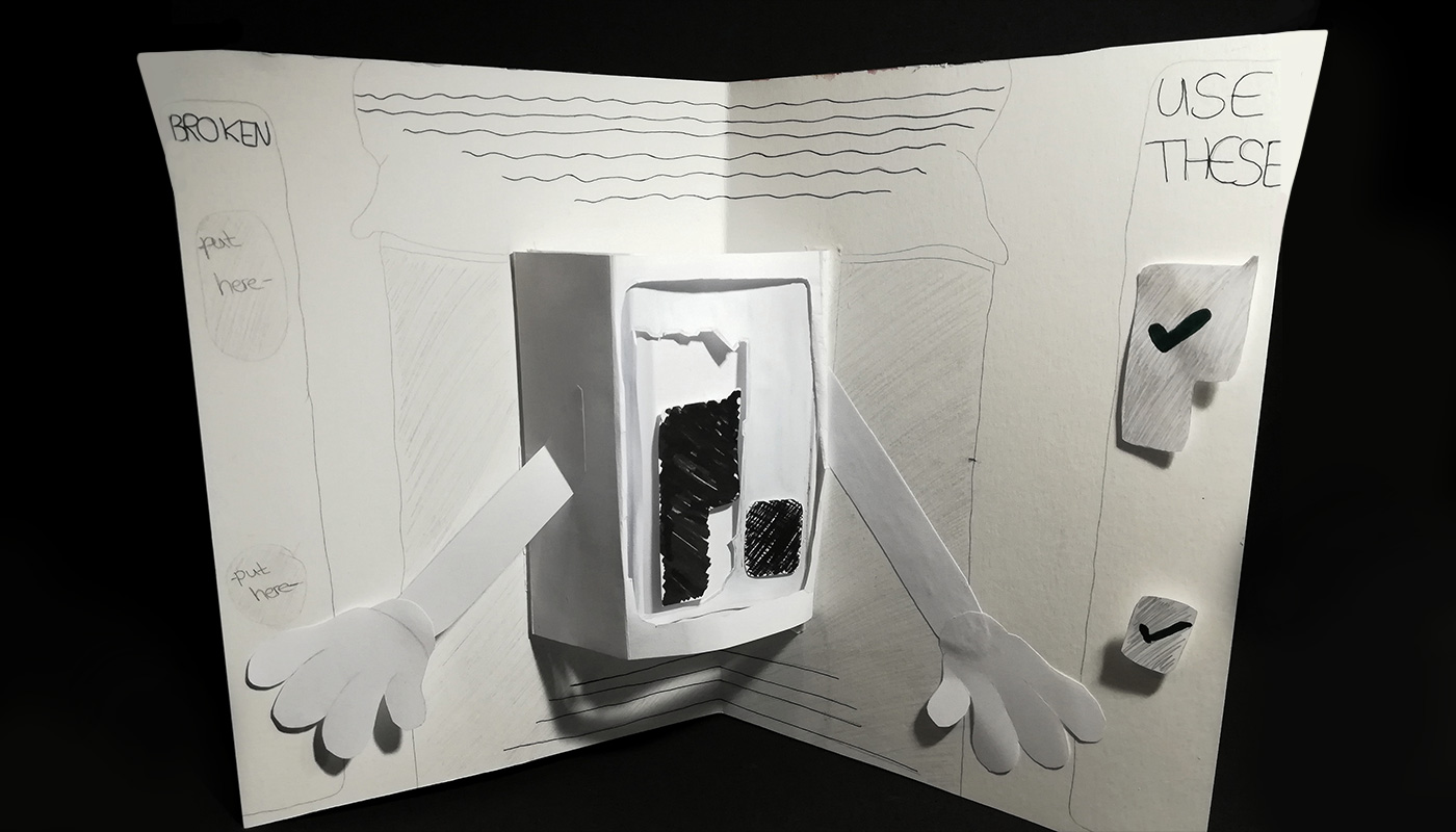 Ein interaktives Ausstellungsstück für die Ausstellung mit dem Thema „Zweckentfremdete Nutzung gestalteter Gegenstände“, das mit Pop-Up Elementen arbeitet und einem dadurch ein gewisses Thema in erzählerischer Form näherbringt. Es könnte zudem im Shop als Souvenir verkauft werden. Das Objekt selbst soll dabei mit dem Cradle-to-Cradle Prinzip den Lebenszyklus eines Gegenstandes, zum Beispiel Elektroschrott, thematisieren. Der Besucher soll sich durch die Interaktion mit dem Objekt verbunden fühlen. Jede Seite, die dabei neu aufgeschlagen wird, überrascht den Betrachter auf wundersame Art und Weise und es wird ein gutes Gefühl bei diesem hervorgerufen, da sich erst durch seine Handlung das Objekt errichtet hat. Zudem nimmt die Geschichte, die so erzählt wird, eine völlig neue Form an, da sie durch ihren dreidimensionalen Charakter bis in den Raum hineinreicht. Sie wird also spannender, aber auch umso schockierender. Der Betrachter hat das Gefühl, die Geschichte im Griff zu haben und doch wieder nicht; sie entfaltet sich erst durch das Aufschlagen, nimmt daraufhin jedoch ihren eigenen Lauf. Zudem sollen Kinder sich durch das Objekt angesprochen fühlen, denn sie sind die zukünftigen Designer dieser Welt.