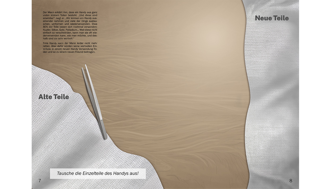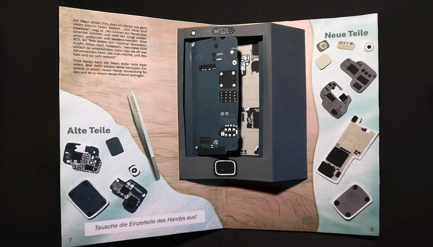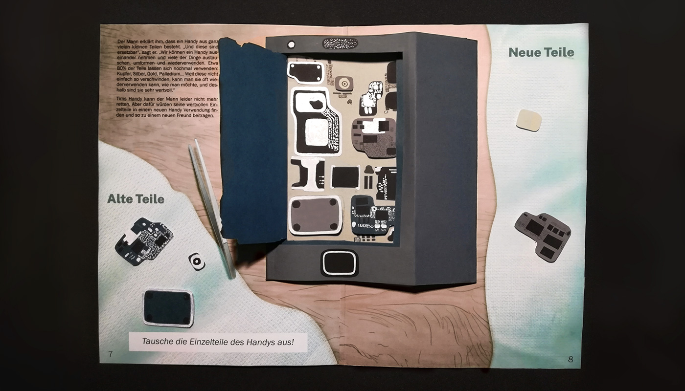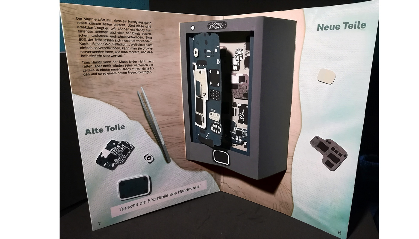 Innerhalb von 6 Wochen haben wir ein vielseitiges Projekt auf die Beine gestellt, das sich intensiv mit Elektroschrott, dem Konsumkreislauf und dem Cradle-to-Cradle Prinzip auseinandersetzt. Kinderfreundlich und interaktiv wollten wir damit alle möglichen Altersklassen erreichen, um diese für eine verbesserte Nutzung von Ressourcen zu begeistern. Dabei haben wir ein erzählerisches Pop-up Buch erarbeitet, das sowohl in der Ausstellung gezeigt, als auch im Shop verkauft werden kann. Insgesamt lief die Erarbeitung des Projektes großartig, da wir uns sehr gut miteinander verständigen und so gerecht die Arbeit einteilen konnten. Das Ergebnis war ein vorzeigbarer, ausgearbeiteter Prototyp zu einem Teil der Geschichte, welcher exemplarisch das Vorgehen in diesem Buch visualisiert.
