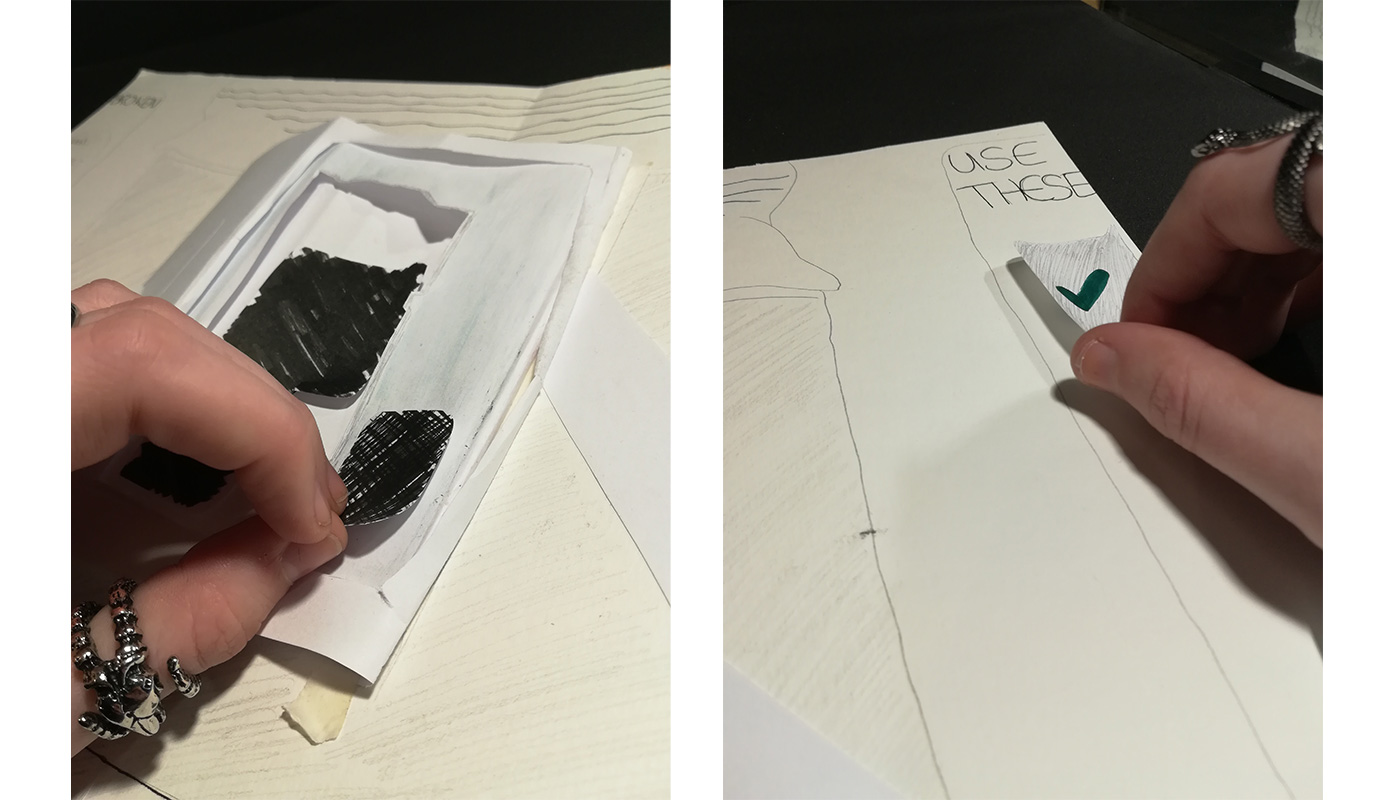 Inspiriert von der NID 7 kamen wir auf zahlreiche Ideen, die Papier beinhalten. Besonders gefiel uns der Ansatz mit Pop-Up-Elementen und wir stellten prompt fest, dass dieser viele Vorteile mit sich brachte, zum Beispiel die Wechselwirkung, die zwischen Pop-Up und Betrachter entsteht.