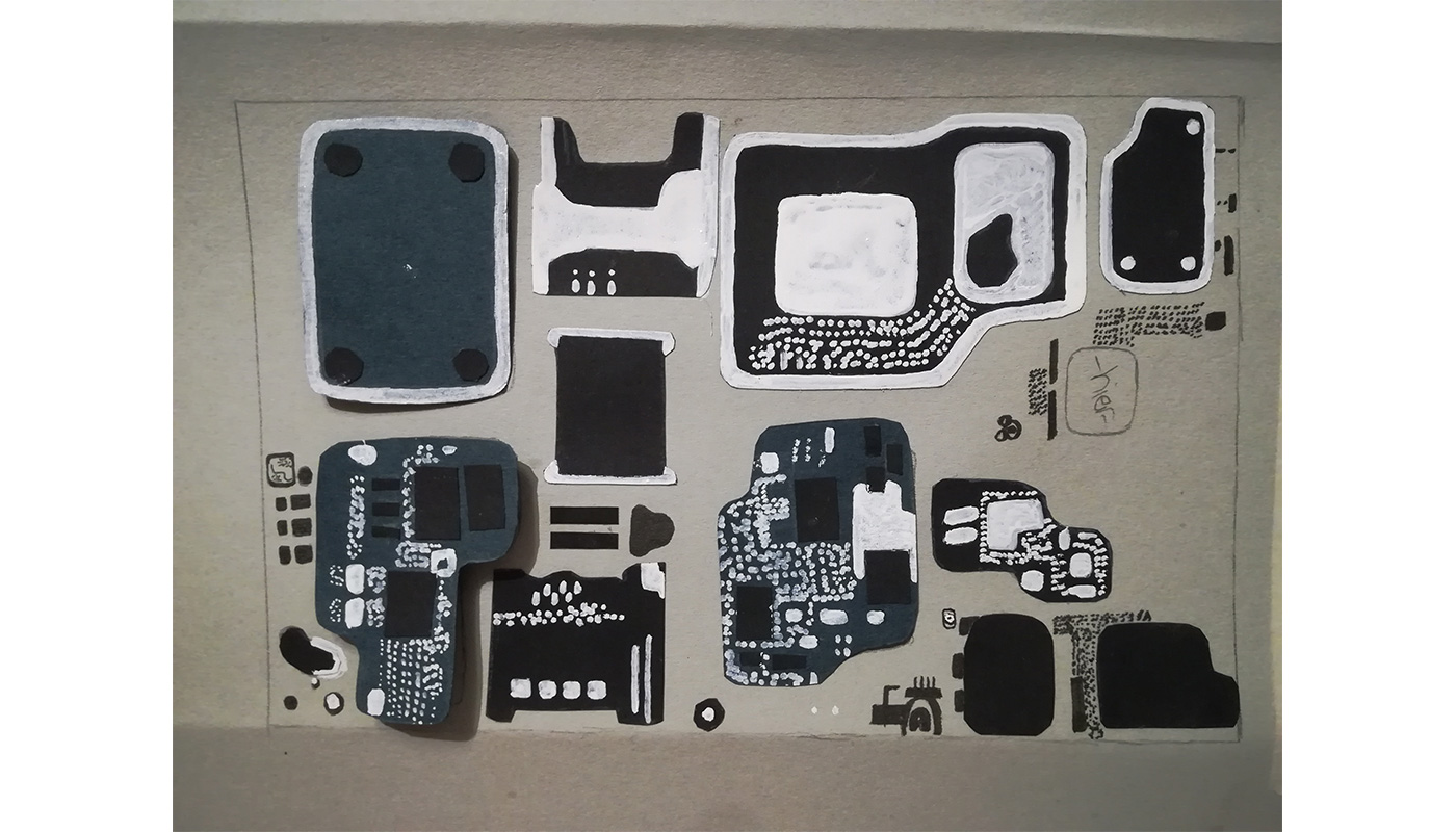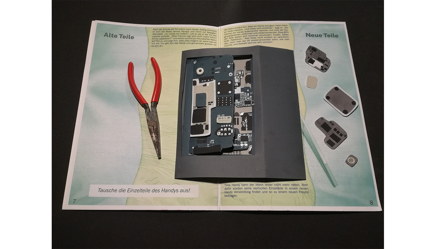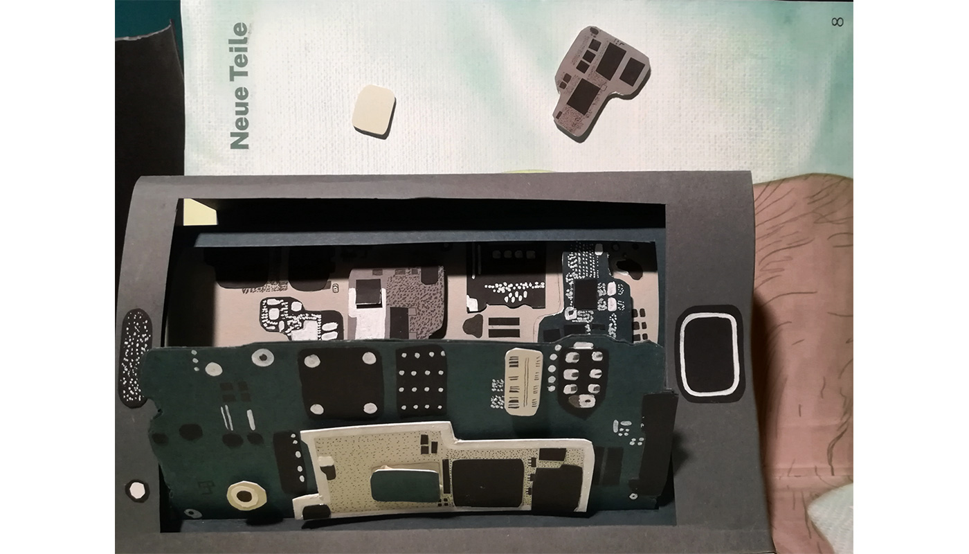 Ein Ausstellungsobjekt, dass mit Pop-Up-Elementen arbeitet, ist bereit zur Präsentation, obwohl sich die Grundidee ein ganzes Buch zu gestalten nicht durchsetzen konnte. Schritt für Schritt entfaltete sich der gestalterische Prozess, sodass sich hinter dem vermeintlich simplen Pop-Up-Buch ein zeitaufwendiges Projekt und gut ausgearbeitete Gedankengänge verbargen. Je intensiver die Arbeit wurde, desto mehr offenbarte sich unsere Liebe für das Detail, die uns besonders bei den Skizzen und der Visualisierungen der Geschichte geholfen haben. Die Detailliebe hatte allerdings auch ihre Nachteile: So nutzten wir für Arbeitsschritte, wie quick and dirty prototyping ausgearbeitete Platinenskizzen, statt diese für unser Endergebnis zu verwenden. Das Zeit-Leistungsverhältnis geriet leicht aus dem Gleichgewicht und unser Vorhaben alle Gedanken innerhalb der 6 Wochen umsetzen zu wollen, war demnach nicht machbar gewesen. Neue Ansätze die Arbeitsschritte aufzuwerten und zu verändern führten dazu, dass von den ursprünglich 4 geplanten Doppelseiten nur eine Doppelseite pop-up-artig dargestellt wurde. Wir sehen dieses Ergebnis als wenig belastend an, sondern bewundern und hegen großen Respekt vor solch einer Detailarbeit. Somit stehen wir 6 Wochen später nicht nur mit einem zufriedenen Ergebnis, sondern auch mit einer aufgestellten Struktur, einem umfangreichen Wissen an Elektroschrott, sowie Handyrecycling und Erfahrungen mit Falt-, Schneide und Illustrationstechniken da, sind uns aber dennoch bewusst, dass auch wir noch Methoden zur Feinarbeit anwenden müssen.