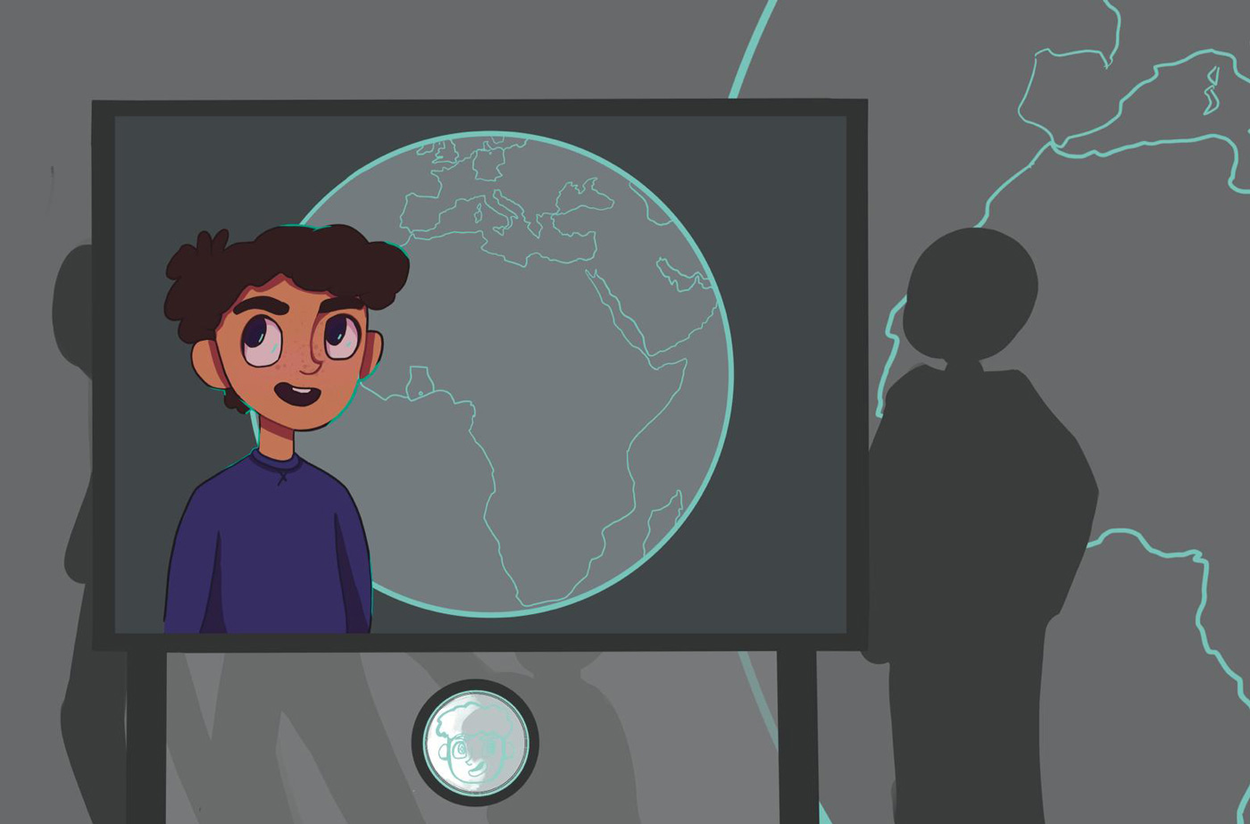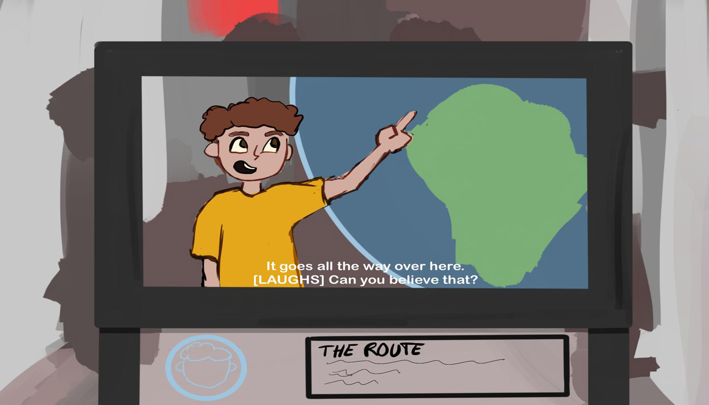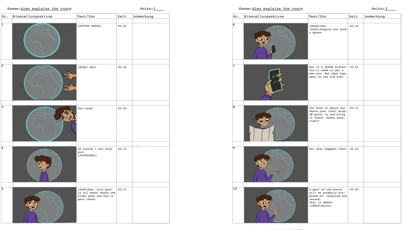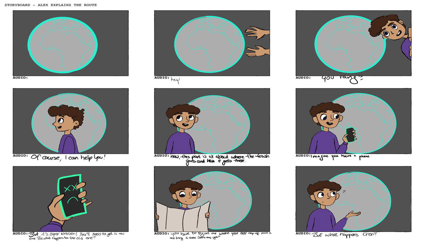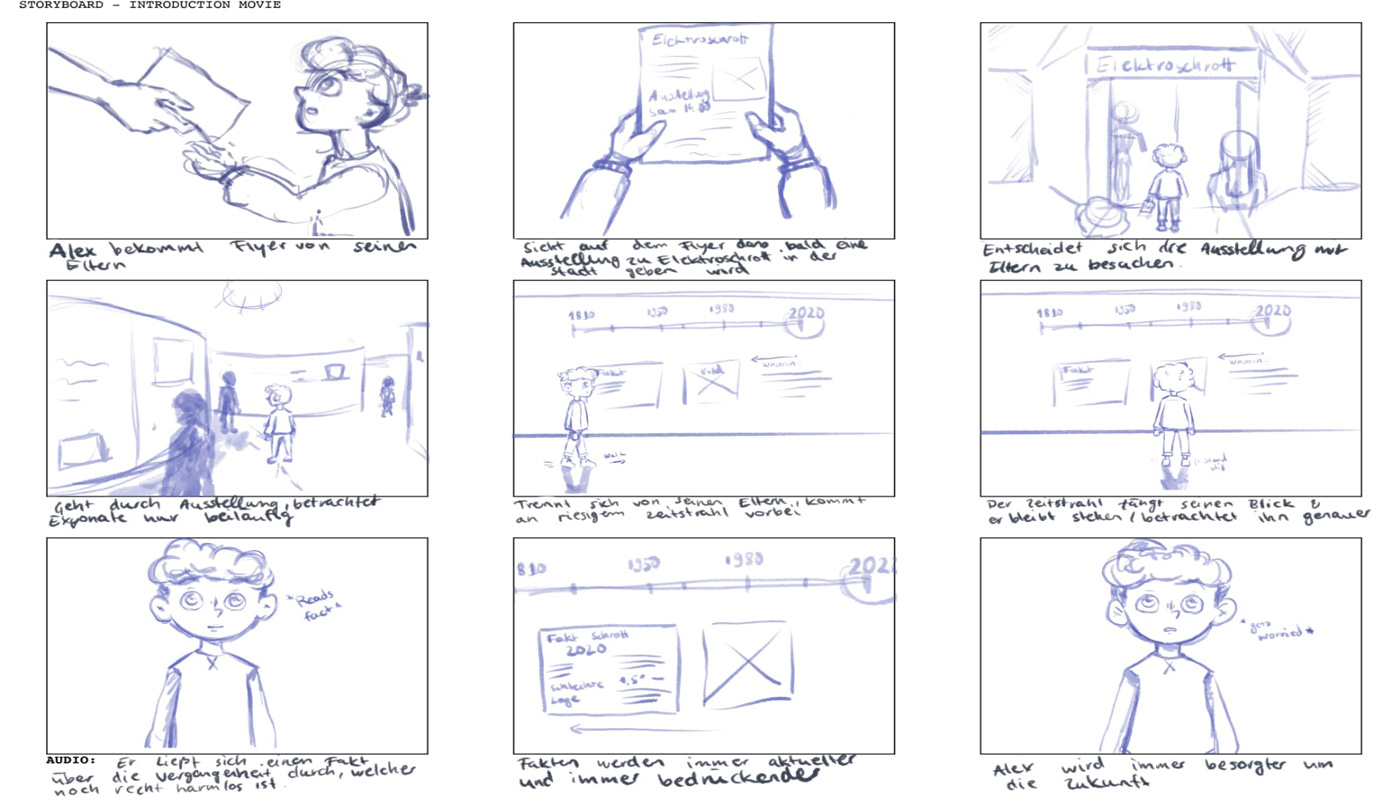 Wir hatten uns dafür entschieden, eine Kinderspur für eine Ausstellung über Elektroschrott zu entwickeln. Diese Kinderspur wird durch einen Charakter namens Alex geführt. Alex ist an jedem Teil der Ausstellung zu finden, sei es durch einen Knopf mit seinem Gesicht darauf, einen Pappaufsteller oder durch Comics, die für alle Kinder einfach zu erkennen und zugänglich ist. Das in diesem Projekt verwendete Beispiel benutzt einen Knopf, welcher einen Erklärfilm aktiviert. Im Laufe dieses Projektes haben wir uns darauf fokussiert, zwei kleine, unterstützende Kurzfilme (Storyboard) zu erstellen. In dem ersten sieht man Alex‘ Hintergrundgeschichte, wo man herausfindet, wieso das Thema Elektroschrott für ihn so wichtig ist und der zweite ist ein Beispiel für einen kurzen Erklärfilm.