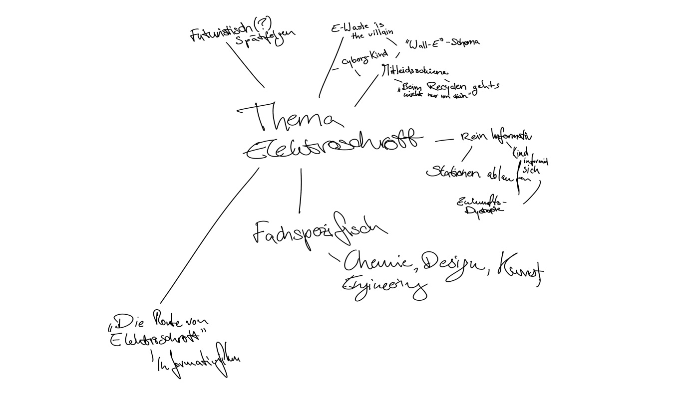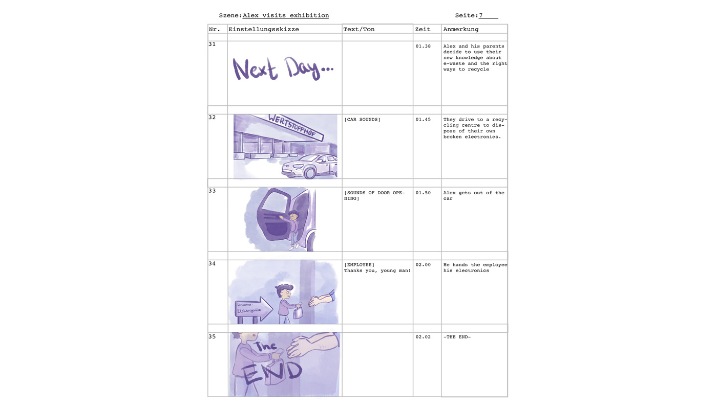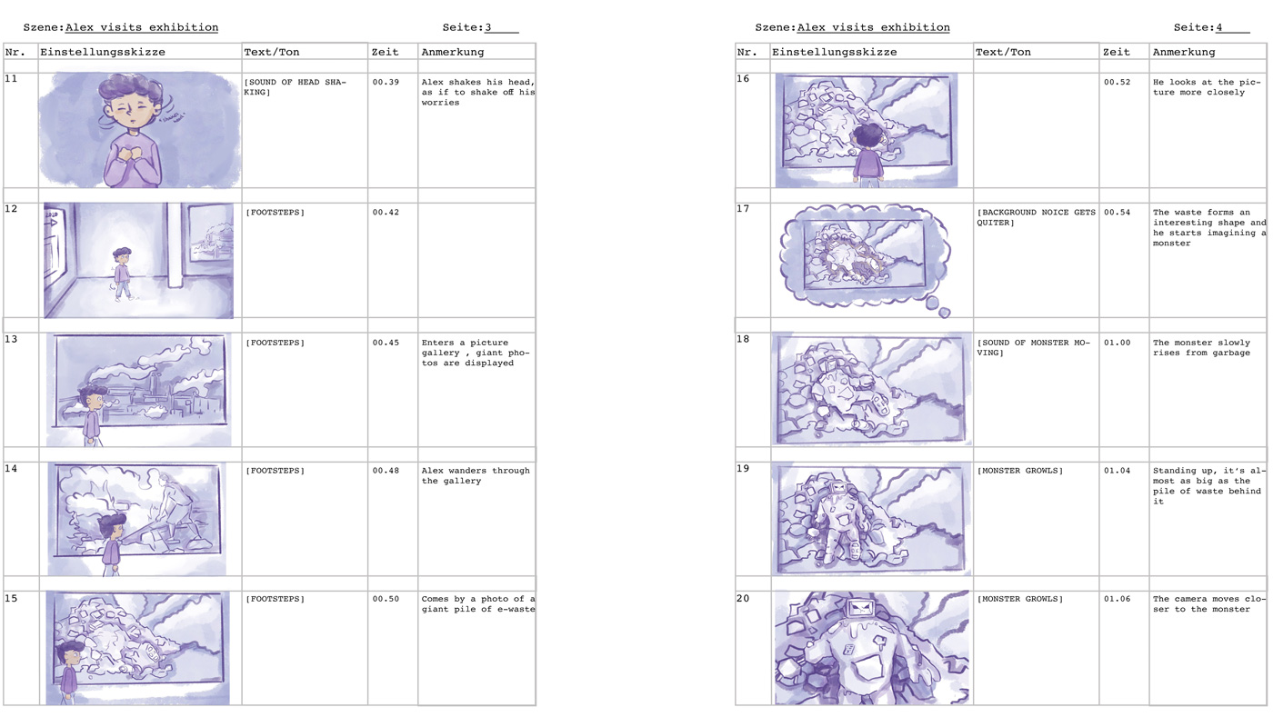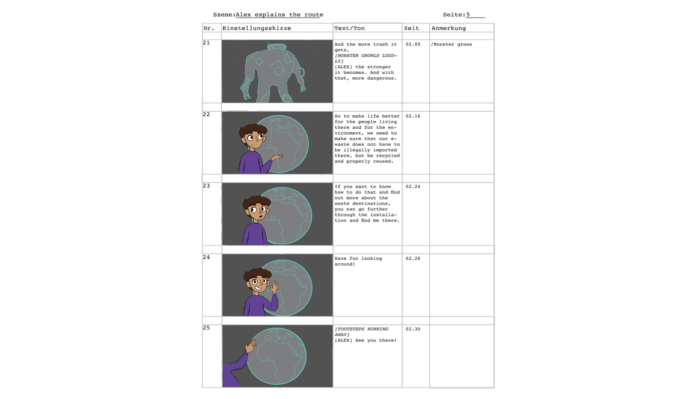 Zuerst haben wir uns über Zoom getroffen, um uns Ideen für einen Kurzfilm einfallen zu lassen. In diesem Treffen haben wir ebenso ausgemacht, dass wir uns jede Woche mindestens zwei Mal, mittwochs und samstags, treffen, um Aufgaben zu verteilen und Fortschritte zu besprechen. Zuerst entwickelten wir die Idee, einen Film über einen kleinen Jungen zu machen, der sich eine Ausstellung über Elektroschrott anschaut und sich durch dort ausgestellte Bilder ausdachte, ein Monster aus Müll zu sehen, dass Unheil verbreitete. Aus dieser Idee einfach einen Kurzfilm zu machen, entwickelte sich schnell weiter. Wir überlegten, einen Kurzfilm, der für Kinder gedacht bzw. an Kinder gerichtet ist zu machen. Die nächste Überlegung war es dann, die gesamte Ausstellung auf irgendeine Weise für Kinder zugänglicher zu machen. Daher hatten wir die Idee, den Kind-Protagonisten aus unserem Film zu nehmen und ihm zum Herz der Kinderspur zu machen. Wir gaben ihm den Namen Alex, ein neutrales, jedoch einprägsames Aussehen und eine Hintergrundgeschichte, die für Kinder inspirierend sein kann, jedoch auch erklärt, woher er so viel über Elektroschrott weiß. Das Konzept des Kurzfilmes nahmen wir und wandelten es in seine „Origin-Story“ um. Dann erarbeiteten wir ein zweites Storyboard zu einem Erklär-Film zur Route des Elektroschrotts. All dies besprachen wir in regelmäßigen Zoom-Calls, und zwischen denen haben wir uns täglich neue Dinge, die wir erarbeitet haben, auf WhatsApp geschickt.