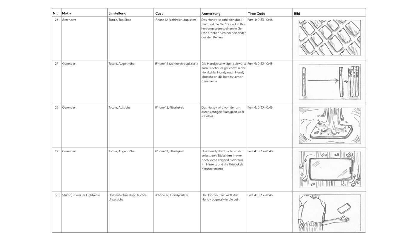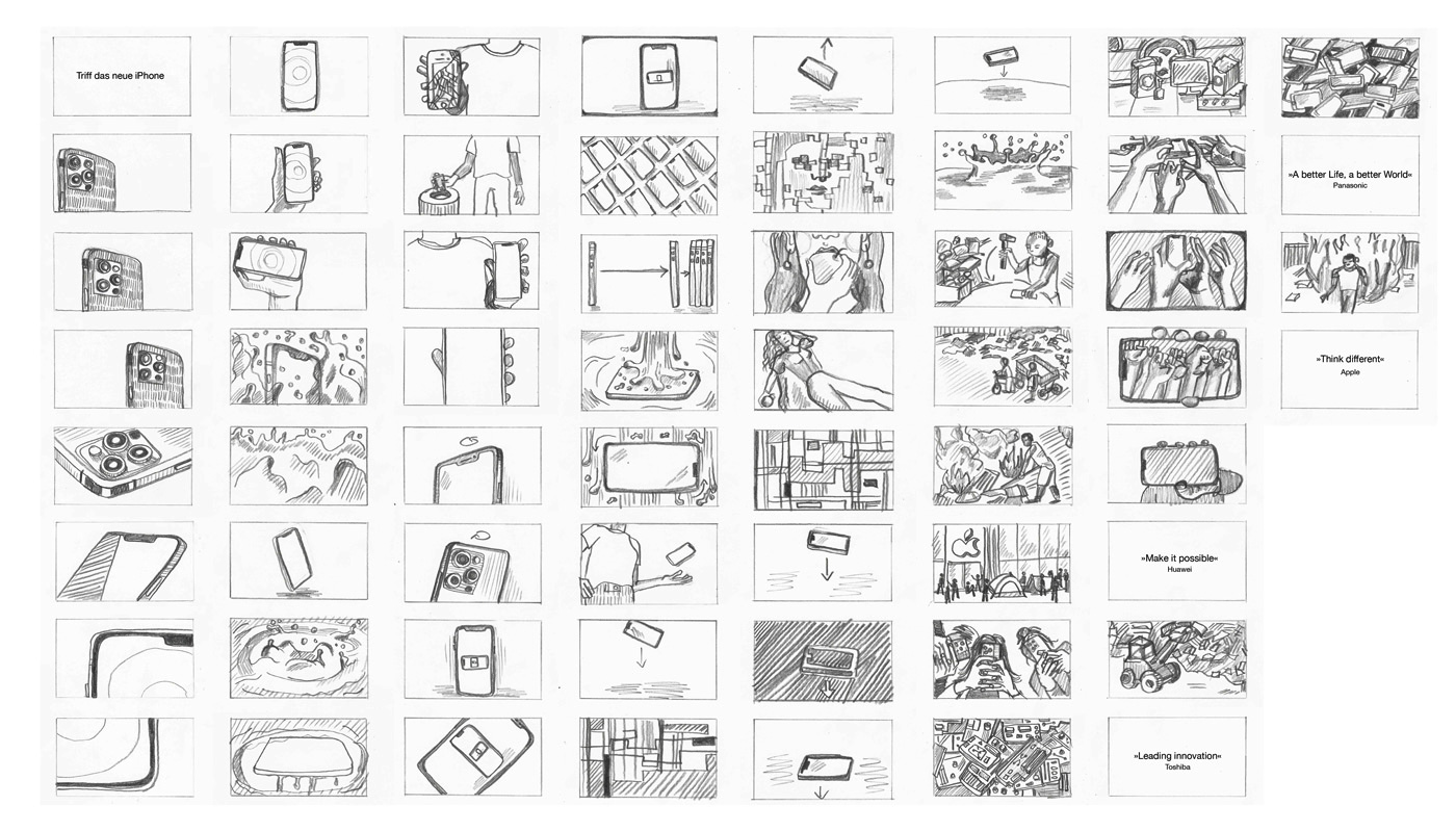 Das Storyboard besteht aus insgesamt 60 analog erstellten Bildern und ist inhaltlich zusätzlich in die Kategorien Nummer, Motiv, Einstellung, Cast, Anmerkung und Time Code unterteilt. Dabei gibt der Time Code noch keine genaue Sekundenangabe im endgültigen Film vor, sondern stellt eine Einordnung in die neun unterschiedlichen Abschnitte des Films dar. Während bis zur Zeitangabe 1:02 min fast ausschließlich gerenderte Produkt-Shots des Handys zu sehen sind – zunächst in der klassischen Darstellung, dann immer chaotischer, schneller und überwältigender – finden sich im Höhepunkt des Filmes bis 1:19 min nur Realbilder wieder. Im Schlussteil sticht die Typografie besonders hervor. Auffällig ist auch, dass sich die Einstellungen im Höhepunkt weiter in die Extreme bewegen, während die meisten Bilder im klassischen Werbeclipsegment auf Augenhöhe angelegt sind. Die zwei ausgewählten Beispielseiten des Storyboards zeigen zum einen die immer ausgelasseneren Produktszenen, zum anderen einen Ausschnitt der Realbilder des Höhepunktes.
