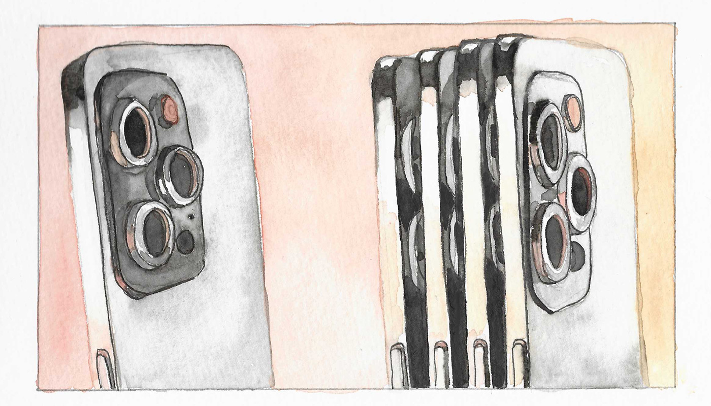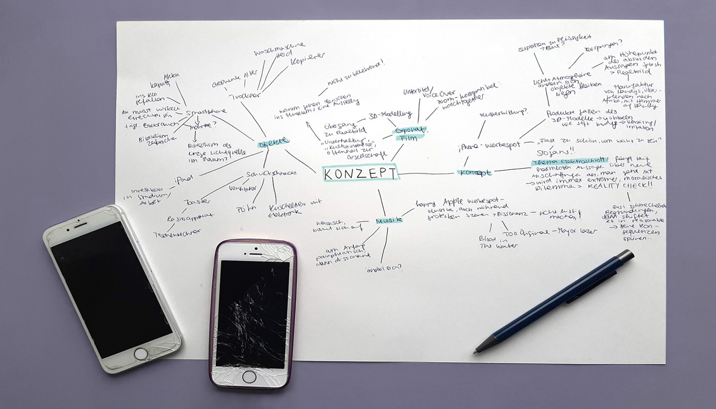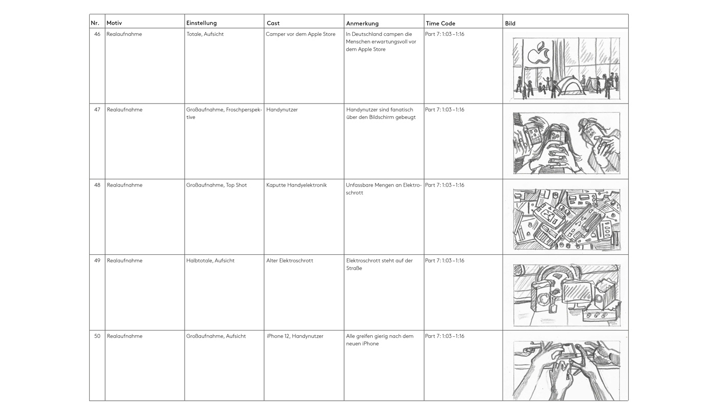 Musikalisch ist unsere Wahl auf den Song »Too Original« von Major Lazer (feat. Elliphant) gefallen. Das Lied gibt der visuellen Ebene ihre Struktur, da sich der zeitliche Ablauf des Films an seinem schnellen Beat und der energetischen Atmosphäre orientiert. Die teils erschreckenden Realbilder führen zu einer spannungsvollen Dissonanz zwischen Bild und Ton. Der Film spielt anfangs mit der Kenntnis des Zuschauers über häufig verwendete Elemente von Apple-Werbespots. So beginnt der Clip zum Beispiel mit Typografie, ebenfalls in der Schriftart San Francisco, welche passend zur Entwicklung des Songs animiert wird. Wir arbeiten mit Detailaufnahmen eines 3D-gerenderten Smartphones in einer ausgeleuchteten weißen Hohlkehle mit dezent farbiger Lichtquelle, um das iPhone als Prestigeobjekt zu inszenieren. Auch die Verwendung von farbigen Flüssigkeiten, aus denen sich das iPhone erhebt, ist ein häufig genutztes visuelles Motiv in der Handywerbung. Nach diesen einleitenden Werbeszenen wird ein altes Handy in den Mülleimer geworfen und ein neues ersetzt seinen Platz. Passend zum Beat folgt ein Schauplatzwechsel, bei dem die Kamera in den Bildschirm des iPhones eintaucht: Die Szenen werden rasanter. Vorherige Szenen werden recycelt, steigern in Form eines Flashbacks das Zuvor-Gesehene und treiben es ins Absurde. Die Typografie wird aggressiver, schneller und füllt den Bildschirm aus. Das Produkt dreht sich für eine Werbung deutlich zu schnell und die Überladung an Informationen wirkt reizüberflutend. Mit dem Einsetzen des Pre-Chorus befinden wir uns in einer Verzögerung, die skeptisch oder unruhig stimmt. Das Smartphone fällt in Zeitlupe in der Hohlkehle. Kurze Blitzer, invertierte Farbe und technische Störungen wie Glitches und Kompressionsartefakte leiten zum Höhepunkt des Films über. Im Höhepunkt wird die Geschwindigkeit der Montage und des Schnitts noch erhöht: Es folgen Realaufnahmen von Menschenmassen, die vor Apple Stores campen und nach den neusten Produkten lechzen. Parallel dazu zeigen wir Sequenzen der unkoordinierten Entsorgung des Elektroschrotts und der damit einhergehenden Verschiffung des Problems. Da unsere Zielgruppe das Privileg hat, sich nur mit diesen Problemstellungen auseinanderzusetzen, wenn sie will, zoomen wir in der nächsten Einstellung wieder aus dem Bildschirm heraus. Der iPhone-Nutzer schaltet das Display aus. Den Abschluss unseres Films bildet ein Wechselspiel aus typografischen Einschüben der Slogans unterschiedlicher Elektronikkonzerne und kurzen Flashbacks der gerade gesehenen Realaufnahmen. Dadurch sieht sich der Rezipient gezwungen, die Slogans hinsichtlich der großen Umweltproblematik zu bewerten.