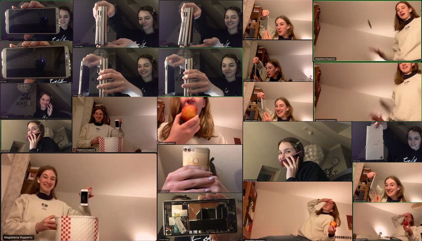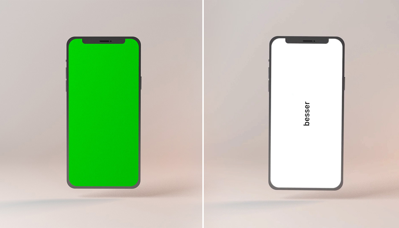Die technische Umsetzung des Prototyps erfolgt mithilfe von Cinema 4D zur Modellierung des Smartphones und Erstellung von Animationen der Produktaufnahmen. Ein Greenscreen dient in einigen Szenen als Platzhalter für ein Handyvideo, das später in den Bildschirm eingesetzt wird. Anschließend verwenden wir After Effects zur Bearbeitung der Bildsequenzen, Animation der Typografie und der Synchronisation der auditiven und visuellen Ebene. Der Prototyp setzt noch nicht eins zu eins das Storyboard um, sondern fasst verkürzt Szenen aus dem ersten Werbeteil, das Eintauchen in den Bildschirm und Ausschnitte der überdrehten Werbeclipszenen zusammen. Dadurch vermittelt er ein erstes Gefühl für die spätere Umsetzung.
