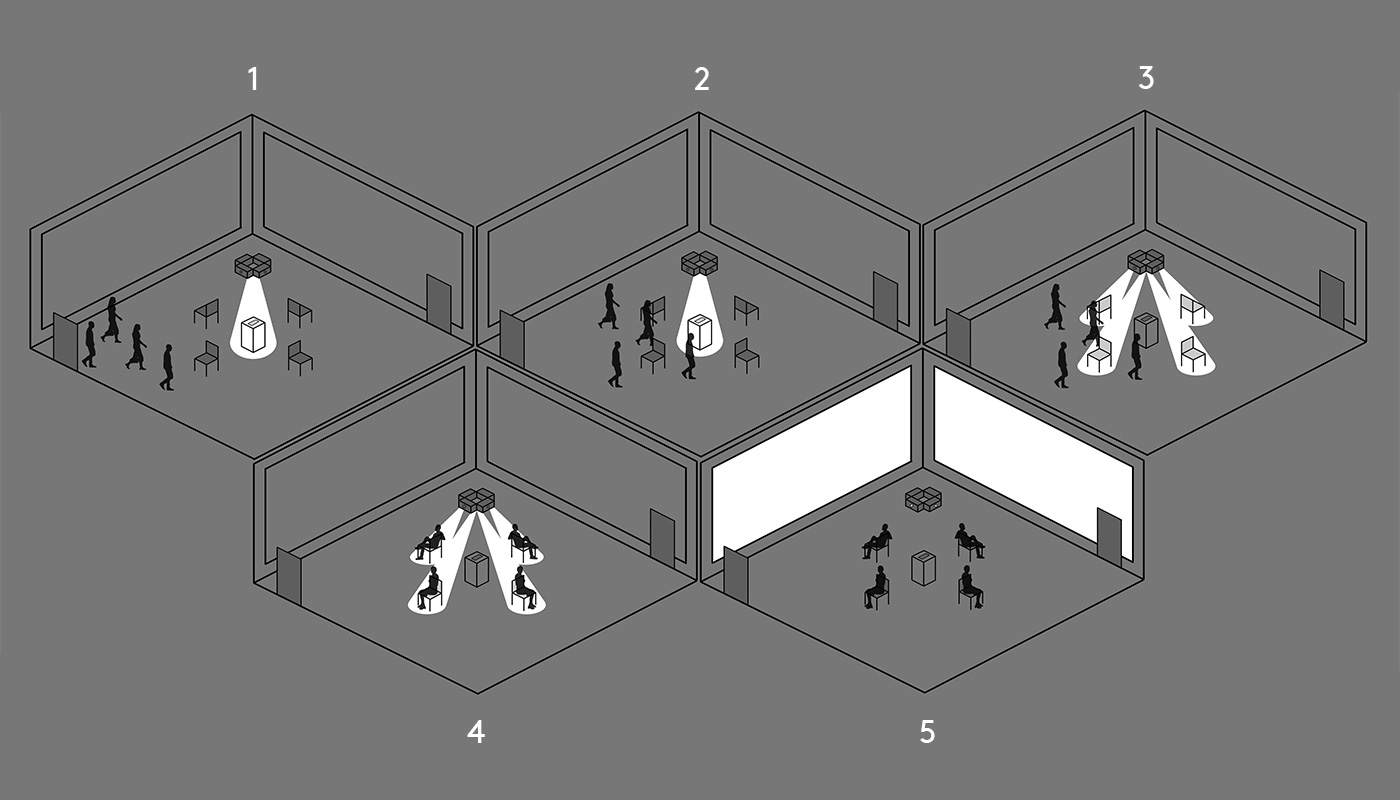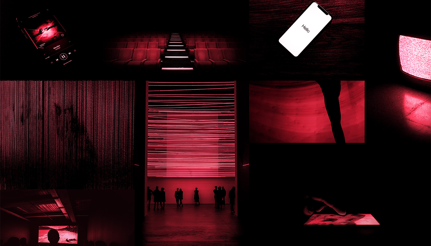 Nach vielen verworfenen Raumkonzepten und unterschiedlich ausgeprägten Stufen der Involviertheit des Zuschauers haben wir uns für eine simple, quadratische Raumstruktur mit Eingang und Ausgang entschieden. In der Mitte des Raumes steht ein Sockel, auf dem ein iPhone platziert ist und der von einem Spotlight beschienen wird. Bewegen sich die Zuschauer in den Messradius des Bewegungssensors am Sockel, strahlen die Scheinwerfer auf vier Sessel, die jeweils auf eine der Wände gerichtet sind. Der Film wird auf alle vier Wände projiziert, teils laufen Bilder und Schriften rund um den Raum herum. Die Apple-Stimme Siri verabschiedet die Zuschauer am Ende. Mit einem Moodboard haben wir für uns die Stimmung des Höhepunkt des Filmerlebnisses eingefangen. Unsere Werbespotästhetik, die wir Apple nachahmen, wird von Unbehagen und Bedrohung abgelöst, welche ein Gefühl des Kontrollverlustes erwecken. Da der Film laute Musik und Strobo-Effekte beinhaltet, muss vor der Installation eine Triggerwarnung für Epileptiker und sonstige fotosensitive Besucher ausgesprochen werden.